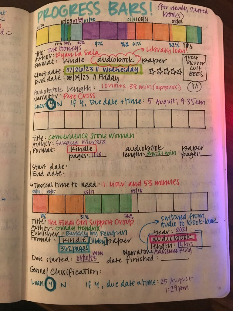It’s not pretty and I’m not promising pretty! This is not one of those lovely ✨aesthetic✨ bullet journals you see on “plan with me!” video tutorials. I use a lot of different colors and none of them mean anything in particular other than keeping my eyes from skipping over information, there are ink smears, sometimes I make a space for something and then not get around to reading it, yada yada yada. But it’s helping me stay on top of reading—like a physical browser tab for that part of my brain. This image shows the way I record book information and fill out a progress bar for satisfying visual feedback, but I also keep notes of what I’m borrowing and buying, lists of things I want to read, quotes with page numbers/timestamps of what I’m reading, etc., etc. The last part is helpful for future book reviews—though I want most to describe the feelings inspired by a book during and after its reading, some details are necessary and if I want to refer back in my write-up, I should have those annotations ready. My challenge here is in resisting the urge to go full project—as so often happens when I’m reading nonfiction and end up taking reams of notes and overwhelm myself trying to discern what I’m actually getting out of it.