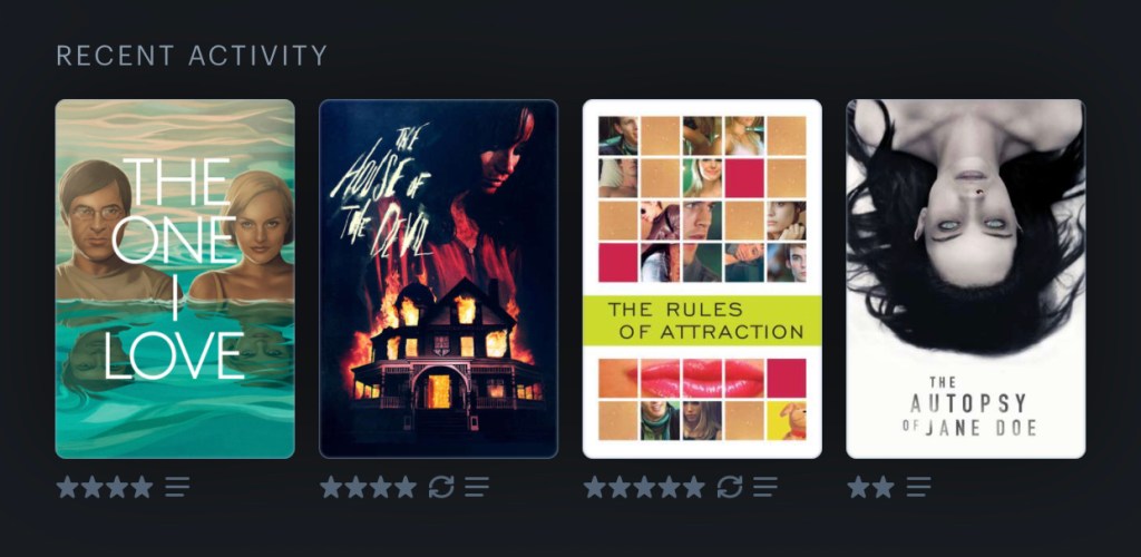 (For your convenience: in the U.S., The Autopsy of Jane Doe (2016) and The One I Love (2014) are both currently streaming on Hulu; The Rules of Attraction (2002) is currently streaming on both PlutoTV and FreeVee, and The House of the Devil (2009) is currently streaming on Shudder. I do not guarantee future availability on these or any other services!)